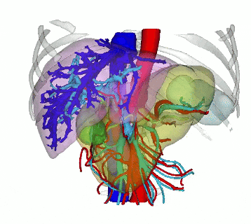 个案分享:胰腺肿瘤切除术前三维重建 CT扫描中,识别出1个病灶-肿瘤 三维重建中病灶位置信息 三维重建肝胆系统动静脉整体预览 三维重建肝胆系统整体预览 肝胆胰腺病灶切除分析