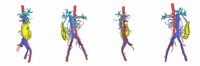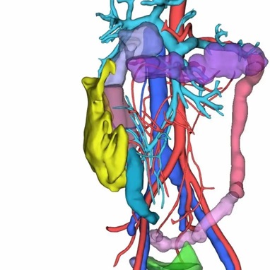 腹腔肿瘤包括肝肿瘤、脾肿瘤、肠系膜肿瘤等。三维重建技术在腹腔肿瘤的诊断、治疗和预后评估中具有重要作用。通过三维重建,可以更全面地展示肿瘤的位置、形态、侵犯范围以及与周围器官的关系,有助于医生制定更精确的手术方案和预后判断。此外,三维重建还可以用于评估手术效果和指导进一步的治疗,例如在机器人辅助手术中,三维重建技术可以提供更精确的手术导航和操作指导。